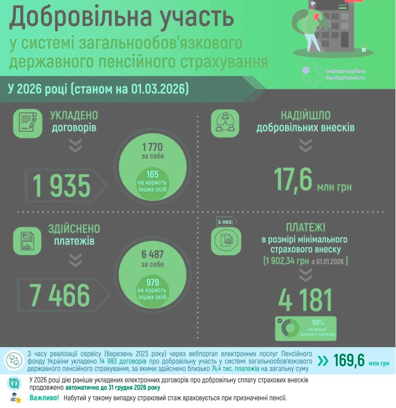Так, з початку 2026 року у системі загальнообов'язкового державного пенсійного страхування здійснено 7 466 добровільних платежів на загальну суму 17,6 млн грн.